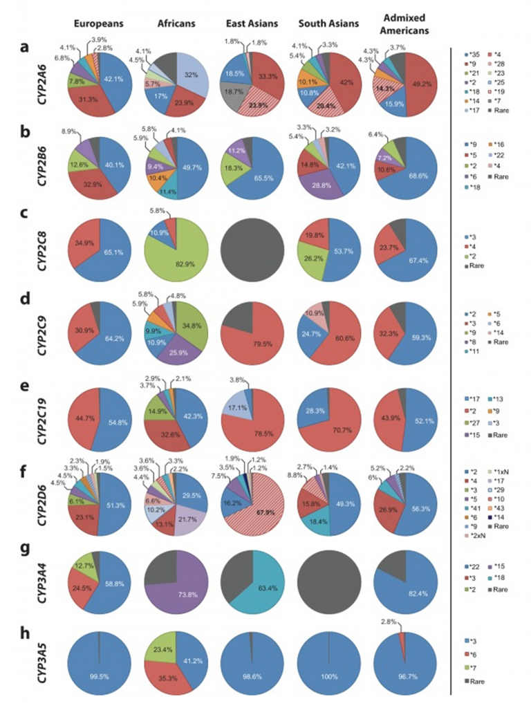 De blå og røde områder viser de genotyper, som ofte omtales som det ‘normale’ = de typer, som er hyppigst blandt europæere og folk af europæisk afstamning. De blå og røde felter repræsenterer de mennesker, som har enzymer, som nedbryder medicinen forholdsvis hurtigt, dvs. som forventet. De øvrige felter viser, hvor stor en procentdel af befolkningen, som enten nedbryder medicinen meget hurtigt (dvs. medicinen har ingen effekt) eller meget langsomt (dvs. der kommer mange bivirkninger).